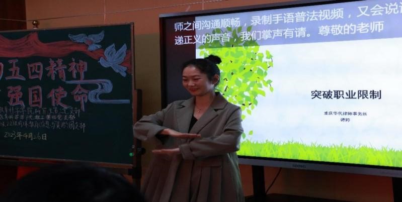 特殊教育(信息与资源)专业,是国内首位通过司法考试的听障人士,现为重庆华代律师事务所执业律师,主要帮助聋人委托人和健听人律师之间沟通交流,录制手语普法视频等,用会说话的手传递正义的声音。谭婷在分享中提到,在面对自己所学的专业以及未来的职业和生活时,经历了迷茫,也遭遇了质疑:“聋人听不到怎么成为律师?”但谭婷最终靠自己的努力突破了自我,并寄语同学们:一定要认真对待专业知识,要树立明确的目标,多利用课外活动提升自己的人际交往能力、人生规划能力等。