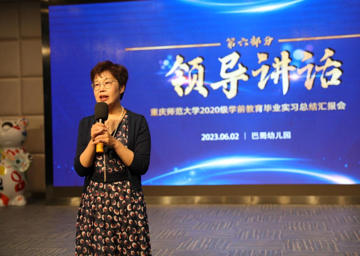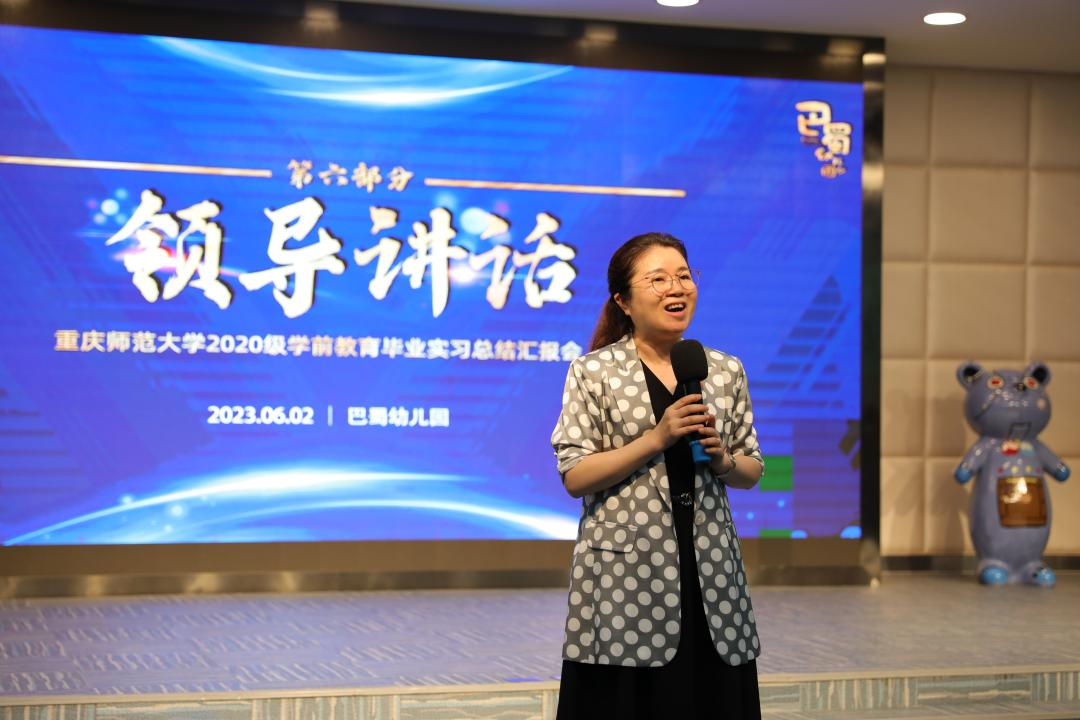 罗虹园长代表幼儿园表达了由衷的欣赏和感谢。她说,“选择学前,用心、用情、用智的去做好我们每一个阶段。培育祖国未来的接班人,在我们自己的心里面、我们的学生身上也要种下爱党、爱国的信念和理想,我们从小把这样的种子种在我们的孩子身上,祖国一定会越来越好。”罗园长表示重师学前的学生能力强,会思考,能吃苦,未来一定会成为有理想的成功的幼儿教师,欢迎学生毕业后到巴蜀新园工作,并表示只要母校有需要,一切无条件支持!