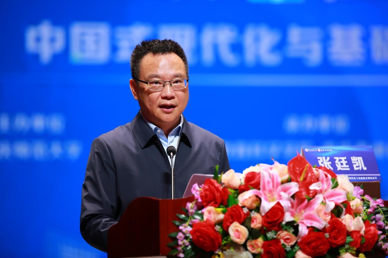 表示衷心感谢。张廷凯回顾了课程学术委员会27年的发展历程,指出委员会始终跟时代步伐,紧扣国家教育改革发展趋势,围绕课程领域的前沿问题、关键问题、难点问题进行了广泛探讨,形成了诸多富有价值的理论共识和实践经验,促进了我国课程研究的深化发展,未来将持续围绕着教育现代化、基础教育课程改革等问题进行了持续思考。张廷凯强调,本次研讨会以党的二十大和习近平总书记就建设教育强国发表的重要讲话精神为引领, 将“中国式现代化与基础教育课程改革”作为研讨会主题可以说是恰逢其时,意义非常。张廷凯期望通过此次研讨会能够引发各位专家学者的深度思考,汇聚智慧、凝聚共识,以此推动我国教育现代化、基础教育课程改革,持续推进教育高质量发展。