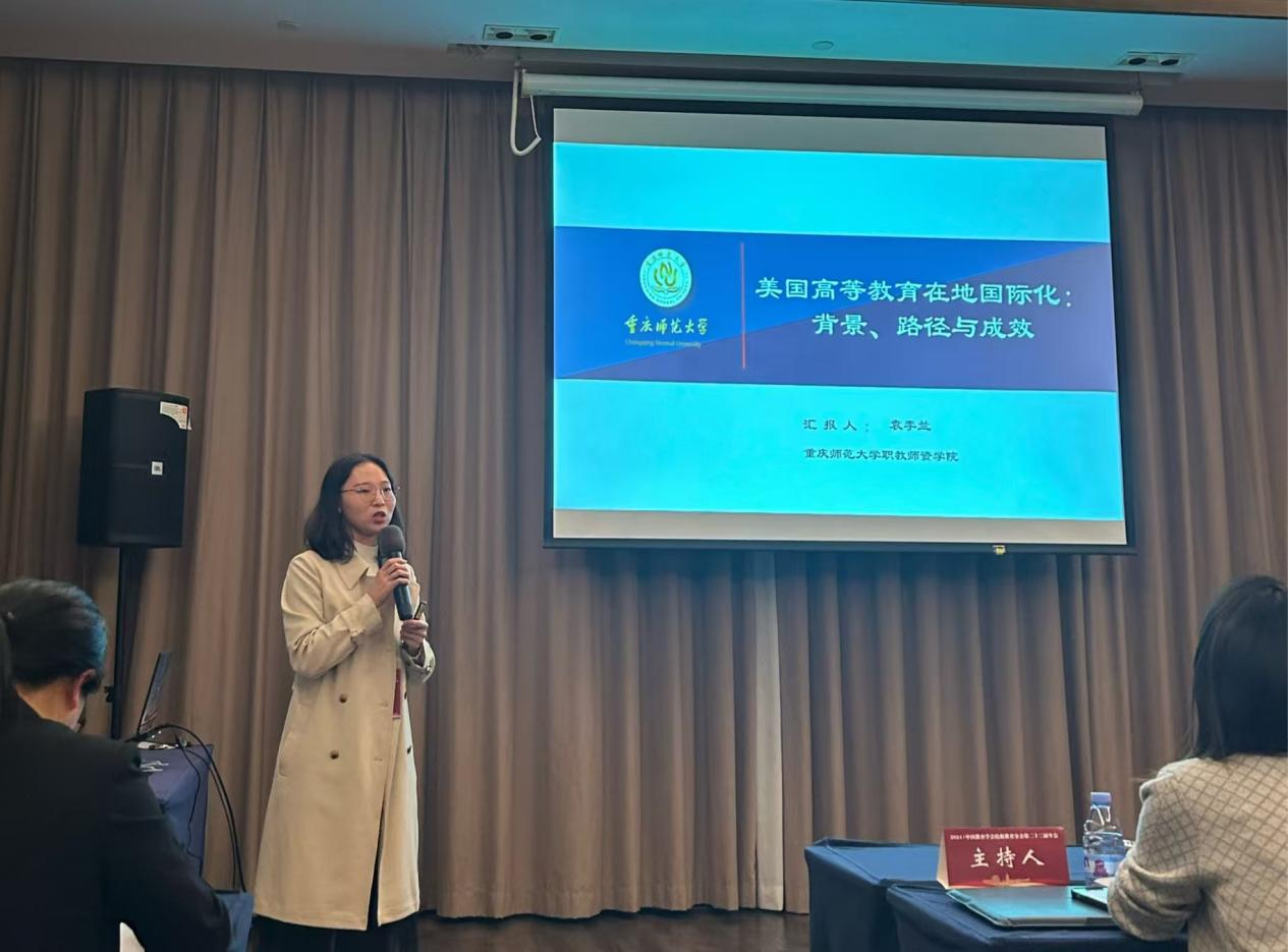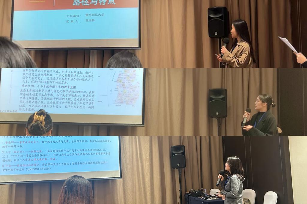 硕士研究生也积极参与汇报交流。曾煜棋同学进行了“英国高校教师数字素养培养路径与启示”的汇报,吕雯倩同学作“美国生态文明教育的现实动因、实践路径与主要特征——以密歇根州为例”的汇报,张柳同学作了“天时地利人和:讲好中国上海求学故事”的汇报。