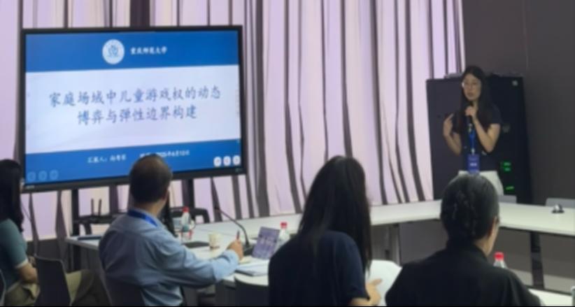 向粤琴在分论坛二上以《家庭场域中儿童游戏权的动态博弈与弹性边界构建》为题进行了汇报,探讨了家庭场域中儿童游戏权的边界内涵,以及面临的三大困境,提到需要构建弹性边界,实现儿童游戏自主性与安全性的平衡。