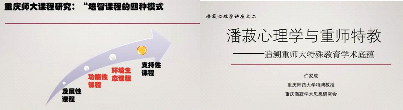 “培智课程”的四种模式进行阐述时,许教授通过列举偏远地区与重庆地区残障儿童的差异来说明环境对于儿童能力发展的影响。随后的交流环节中,许教授针对同学们所提出的问题,给予了细致解答。最后,许教授向同学们提出了在潘菽学术思想基础上多做思考、不断完善潘菽理论的美好愿景。