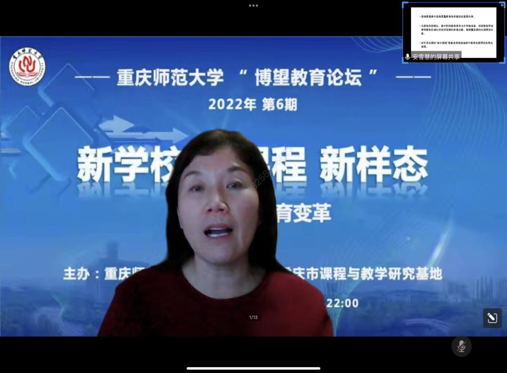 的“小梅花课程”,生动展现了“红梅花儿开,朵朵放光彩”的教学理念,并提出了学习方式变革与创新的三条路径。西南大学附属中学副校长黄仕友以“树人从树师开始!”一句话为线索,以“表扬:教师发展的探索与实践”为主题,对表扬在教师发展中发挥的重要价值作了精彩讲解,分享了表扬教师的新案例、新见解、新观察、新视野。安雪慧教授以“新型城镇化背景下县中高质量发展”为主题,从县中高质量发展的现实意义和县中发展不平衡不充分的表现及影响因素两方面进行详细分析,并提出了独到的个人思考与看法。微讲座结束后,互动气氛热烈,三位专家同与谈人及其他参会师生一起对话,围绕讲座主题进行深入探讨。