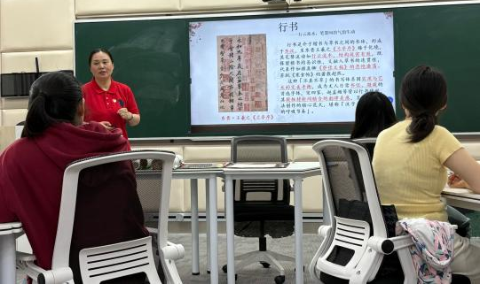 支部书记肖颖同志以中国文字发展为脉络,依次介绍了甲骨文、金文、篆书、隶书、行书、草书、楷书等各种字体,再从“永字八法”基础笔画到爱国诗词现场书写,通过字形结构与革命文献的有机融合,使参训党员直观认识汉字承载的文化基因与民族气节。在场党员深刻体会到,汉字不仅是文化符号,更是抗战精神的载体。