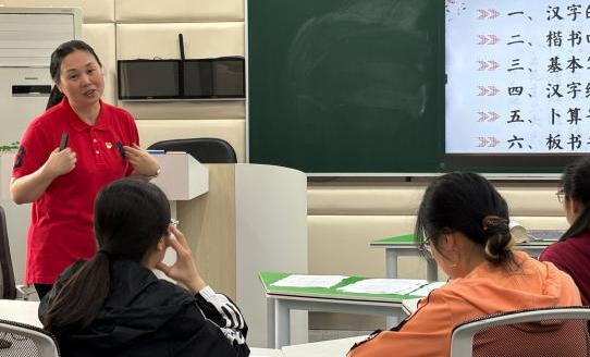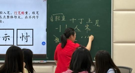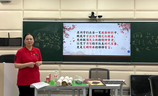 支部书记肖颖同志以中国文字发展为脉络,依次介绍了甲骨文、金文、篆书、隶书、行书、草书、楷书等各种字体,再从“永字八法”基础笔画到爱国诗词现场书写,通过字形结构与革命文献的有机融合,使参训党员直观认识汉字承载的文化基因与民族气节。在场党员深刻体会到,汉字不仅是文化符号,更是抗战精神的载体。